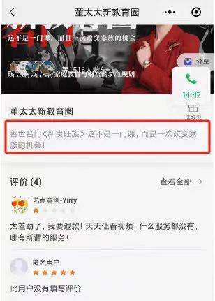这门售价6980元的课程名为《新贵旺族》,家长们试图从更贵的付费里获取更多的知识。受访学员提供的截图显示,该课程还有“其他1500余人参与”。换言之,仅依靠这门付费课,董太太就有至少1047万元进账。