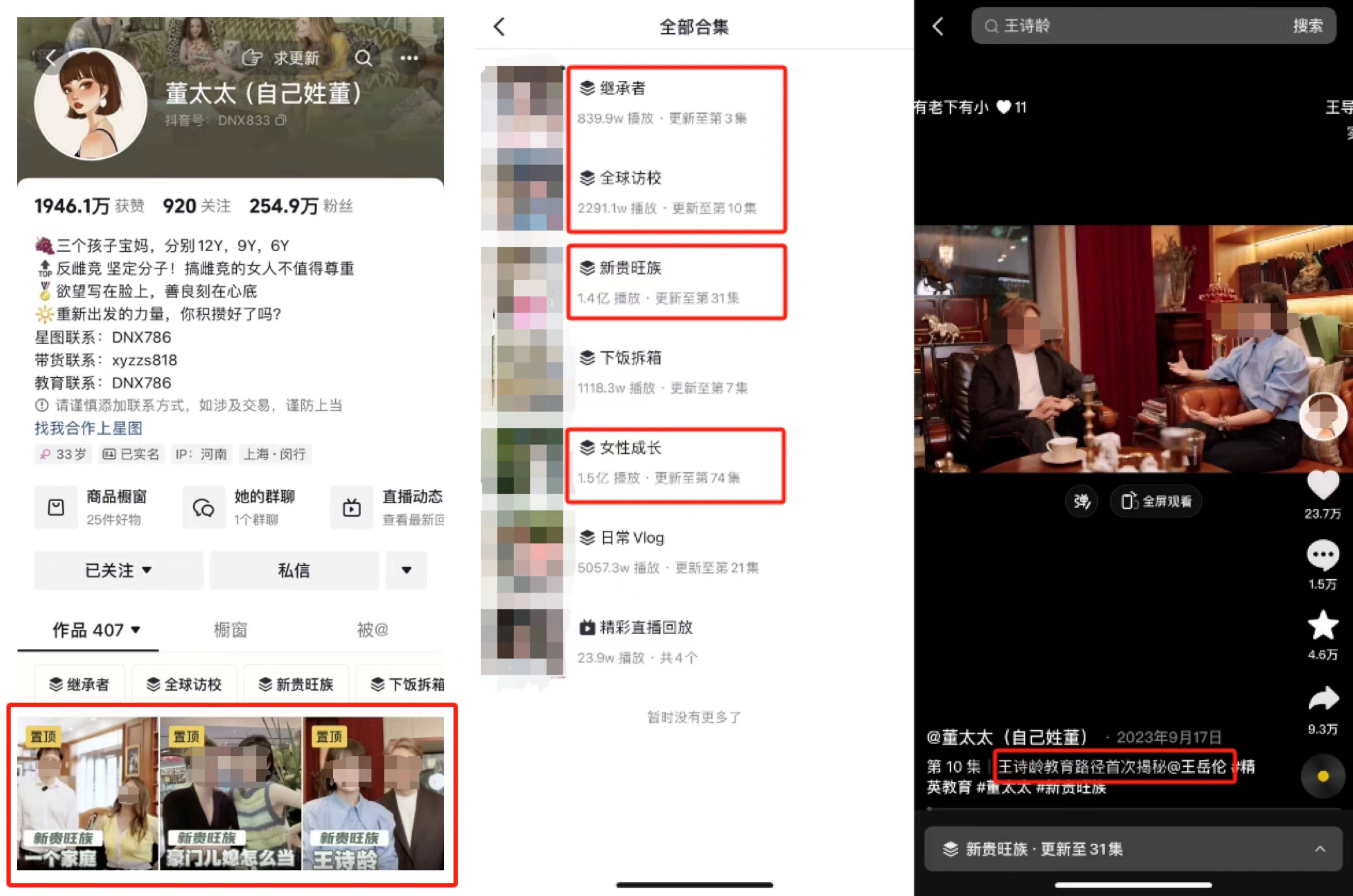 在海报、直播间和短视频作品中,董太太自述毕业于211郑州大学(高考585+20分特长分),拥有超过十年的精英教育经验。名人访谈和访校分享是她短视频作品的重要组成,其中访谈的角色一般是企二代、富二代或者所谓的“新贵旺族”。