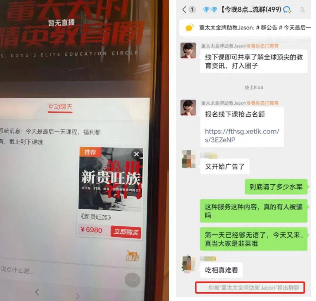 这门课是放在董太太的抖音直播间里公开售卖的,好奇的、焦虑的家长很容易为此付费。添加助教微信后,学员会被拉进一个微信群中,群内有第三方直播链接和课程资料。早在二月就购买了该课程的葛女士表示,三天直播课程中重复的内容过多,其中还有大量时间都在宣传6980元的进阶课程。她觉得干货太少广告太多,就申请退费并在课程结束时提出了质疑。但很快,葛女士看到自己被移出群聊。