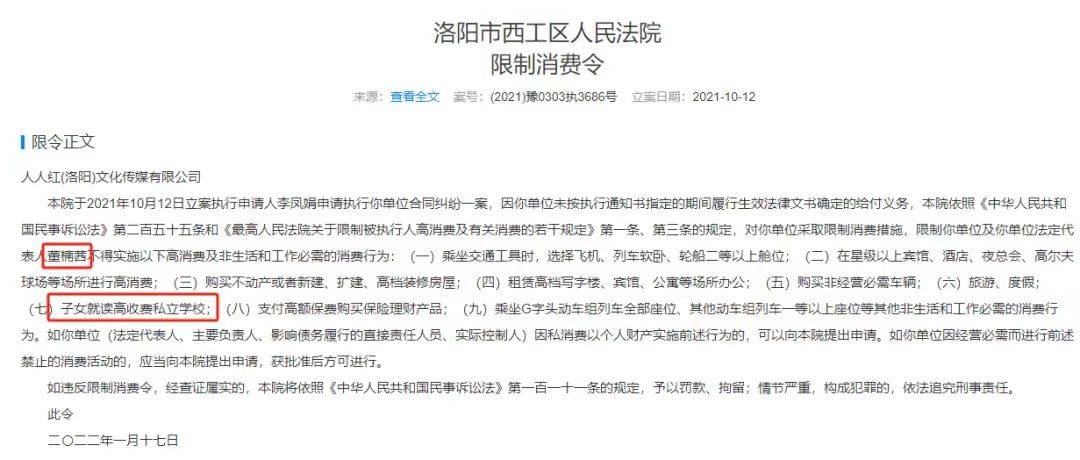 人人红前法定代表人董楠茜的限消令 / 天眼查