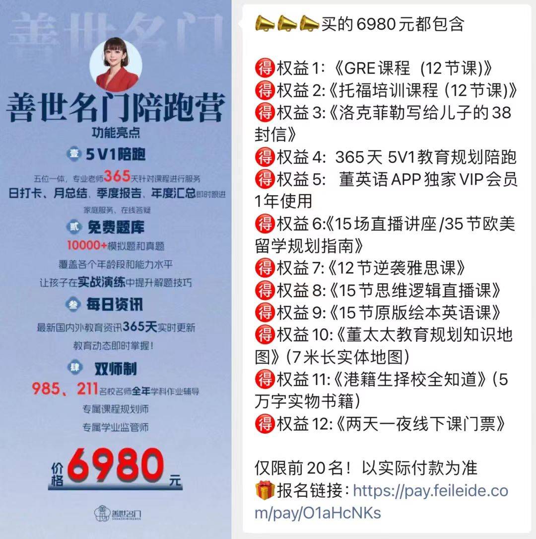 据知情人士透露,早在6980元《新贵旺族》课程之前,董太太就办过多场“新贵旺族线下活动/精英子女教育规划研讨会”。董太太团队曾多次在线下课宣传“家董会”,鼓励家长们进圈“氪金鸡娃”,将来“一起上藤校未来做亲家”。