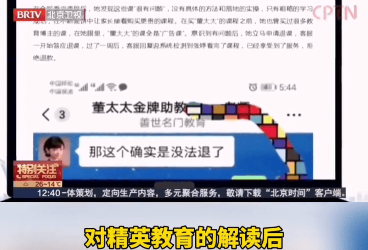 事发前,也就是5月6号晚,北京卫视重点点名董太太,称其售卖的“名门贵族教育”名不副实,存在欺诈行为,另外,这种精英式的教育存在不良价值导向。