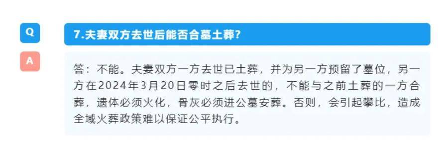 记者注意到,《问答》中还提及,《通告》开始执行之后,特殊情况下夫妻双方也不能合墓土葬,“夫妻双方一方去世已土葬,并为另一方预留了墓位,另一方在2024年3月20日零时之后去世的,不能与之前土葬的一方合葬,遗体必须火化,骨灰必须进公墓安葬。否则,会引起攀比,造成全域火葬政策难以保证公平执行。”