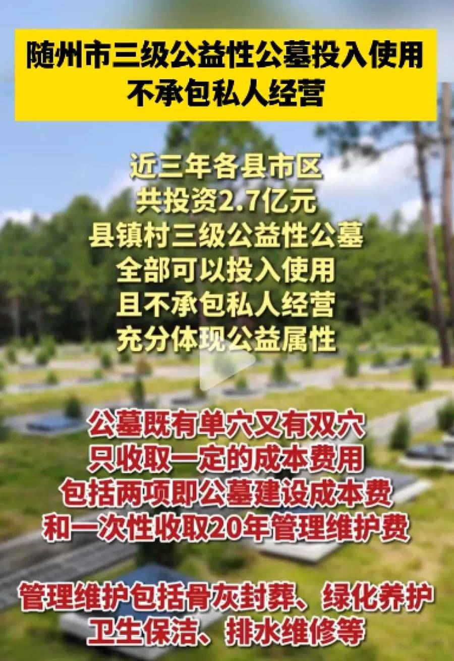 同月13日,随州日报微信视频号发布视频报道,称近三年各县市区共投资2.7亿元,县镇村三级公益性公墓全部可以投入使用,且不承包私人经营,充分体现公益属性。