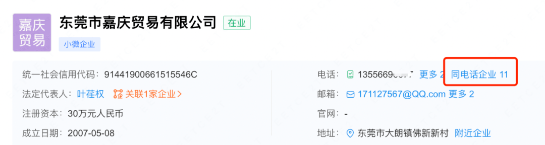 然而,企查查显示,嘉庆贸易的公司电话为1355669xxxx,而同电话企业数量高达11家,这样的企业能够向长联科技销售上千万的贸易额,实在是令人不解。