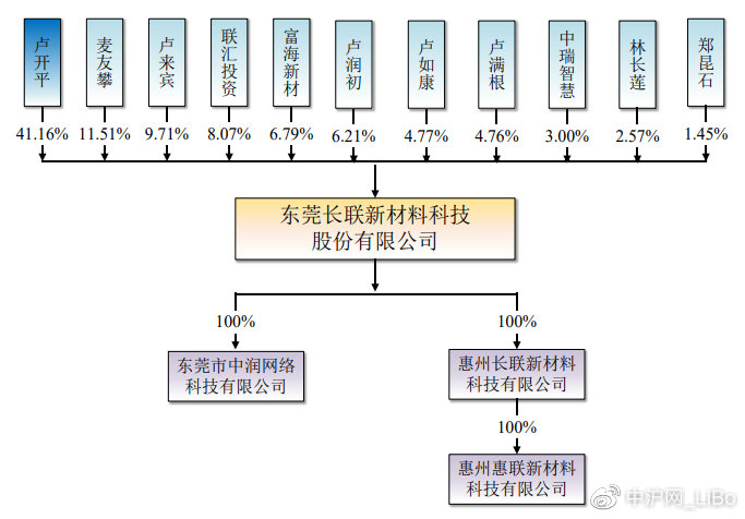 根据最新招股书显示,长联科技是一家典型的家族企业,卢开平为长联科技董事长及法定代表人,本次发行前,卢开平直接持有长联科技41.16%股份,通过担任联汇投资的执行事务合伙人而间接控制长联科技表决权比例为8.07%,因此,卢开平控制长联科技的表决权比例为49.23%,为长联科技第一大股东。截至本招股说明书签署日,长联科技股权结构图如下: