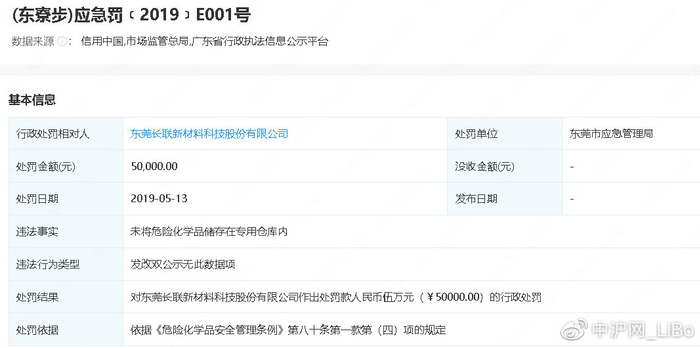 而据公开资料显示,长联科技在2019年5月13日因未将危险化学品储存在专用仓库内,被东莞市应急管理局依据《危险化学品安全管理条例》第八十条第一款第(四)项的规定作出罚款人民币5万元的行政处罚。