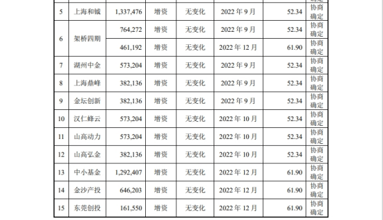 2022年9月,上海和钺、湖州中金、架桥四期、上海鼎峰、金坛创新以合计1.80亿元认购公司新增343.92万股股份,增资价格为52.34元/股,对应公司投前估值16亿元,投后估值为19.6亿元。