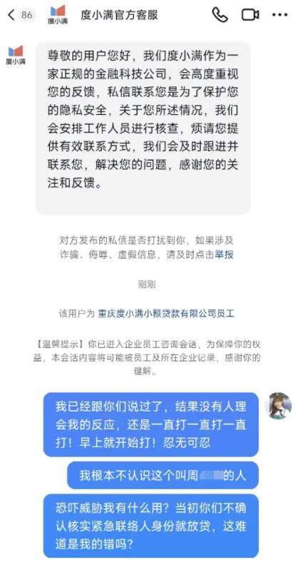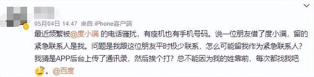 近日,有网友社交平台反映,“最近频繁被度小满电话骚扰,有座机也有手机号码。说一位朋友借了度小满,留的紧急联系人是我。问题是我跟这位朋友平时极少联系,怎么可能留我作为紧急联系人?我猜是APP后台上传了通讯录,然后挨个打?”