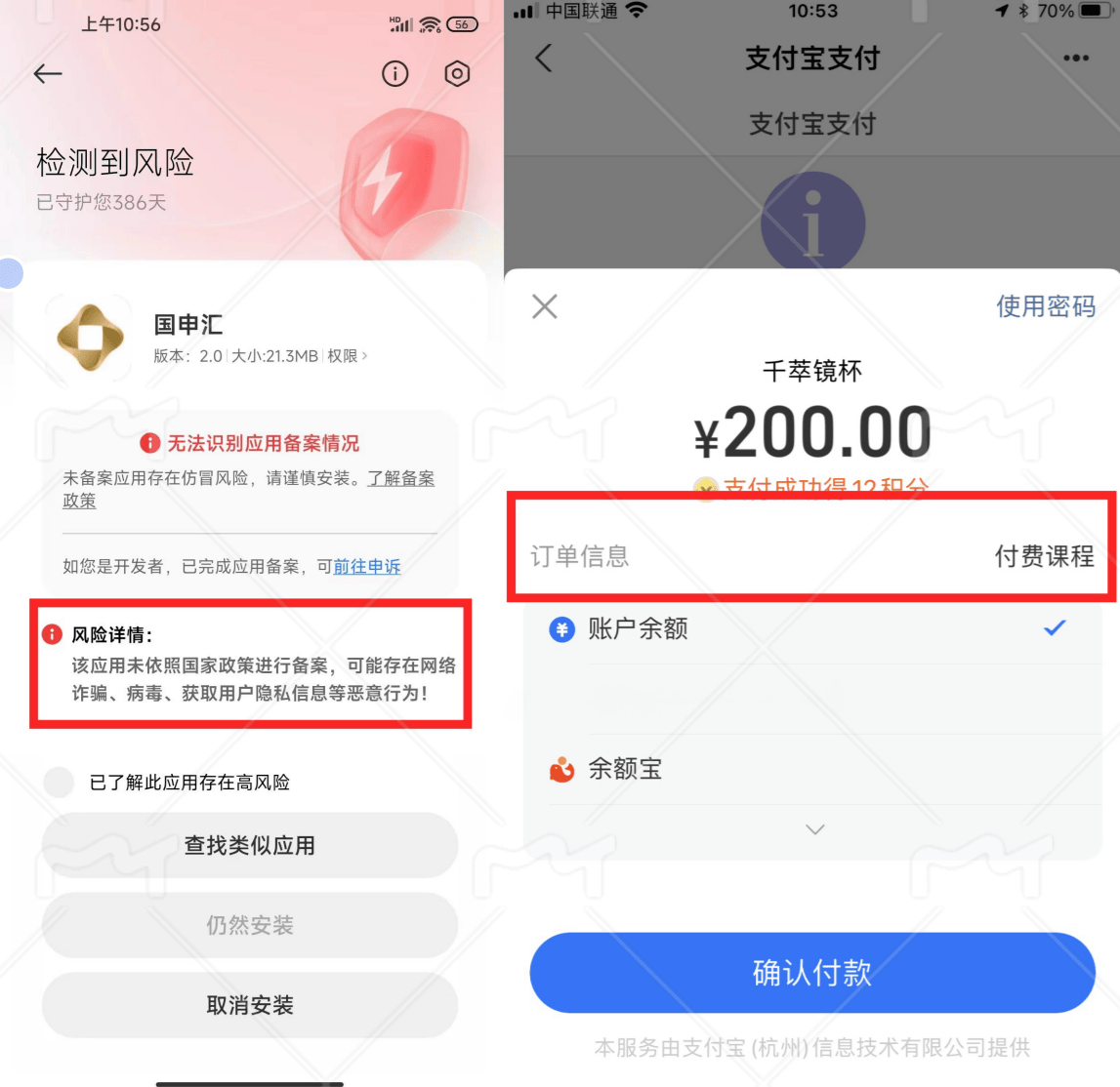 李先生讲,他是在老乡群看到有人发送一个投资理财宣传资料,他抱着试一试的态度,按照提示下载安装,随后却发现很多问题,该平台宣传是一个国企投资平台,宣称门槛低、收益高、福利多等等消息,可是在投资充值时,支付宝转账是到个人支付宝,不是公账,而且转账订单提示是付费课程,看到这些信息,李先生觉得遇到了诈骗。