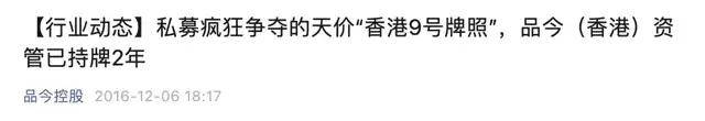 2014年,品今(香港)资管成立,并拿到了私募疯狂争夺的天价“香港9号牌照”。据悉,国内的私募机构持有该牌照,意味着在国际资本市场上获得了“通行证”,不仅可以直接参与境外的投资,还可以吸引海外投资者的资金。目前9号牌已成为很多内地机构需求最旺的一类牌照。9号牌照可以做的事情有很多,比如帮客户做海外资产配置,还可以做投资咨询等多元化业务,同时投资手段和工具更加丰富,并且可以吸引海外资金投资国内市场。