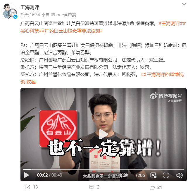 2024年5月17日,知名打假人王海的“王海测评”发布微博称:广药白云山图姿兰雪娃娃美白保湿祛斑霜涉嫌非法添加和虚假备案。