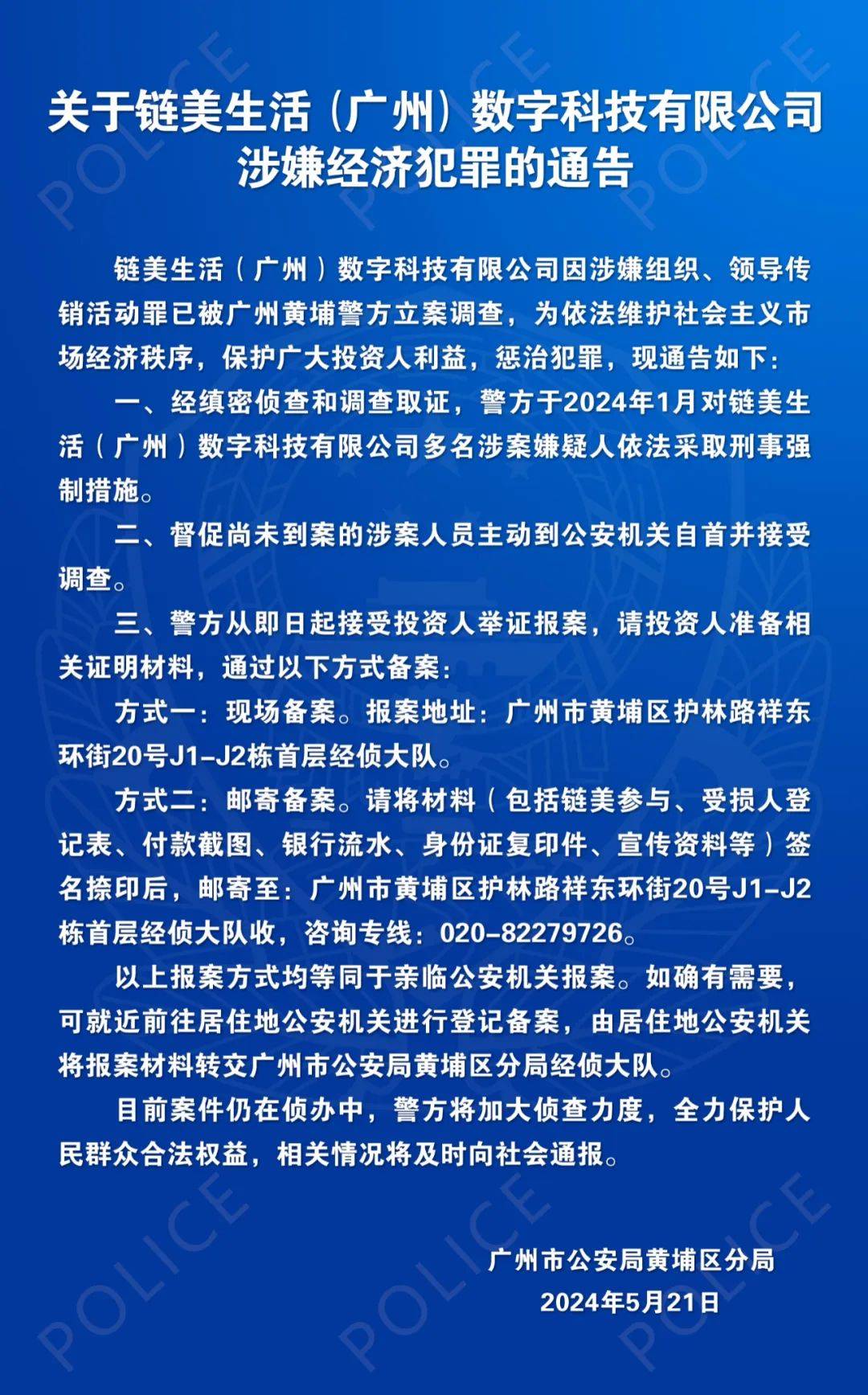 一、经缜密侦查和调查取证,警方于2024年1月对链美生活(广州)数字科技有限公司多名涉案嫌疑人依法采取刑事强制措施。