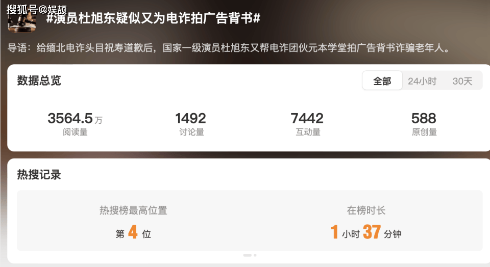 5月25日,知名打假人王海在社交平台爆料称,国家一级演员杜旭东竟然为缅北电诈头目祝寿并道歉后,又为电诈团伙元本学堂拍摄广告背书,涉嫌助纣为虐,令人震惊!