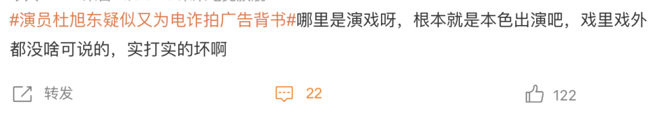 这一诈骗模式与此前上海、宁波警方破获的短视频变现课诈骗案件如出一辙。杜旭东作为国家一级演员,其参与为此类非法行为背书,实为社会舆论的一大震撼。网友纷纷评论“相由心生”“这黑心钱也赚”“戏里戏外都是实打实的坏啊”。可见网友对杜旭东的好感已经全无了。