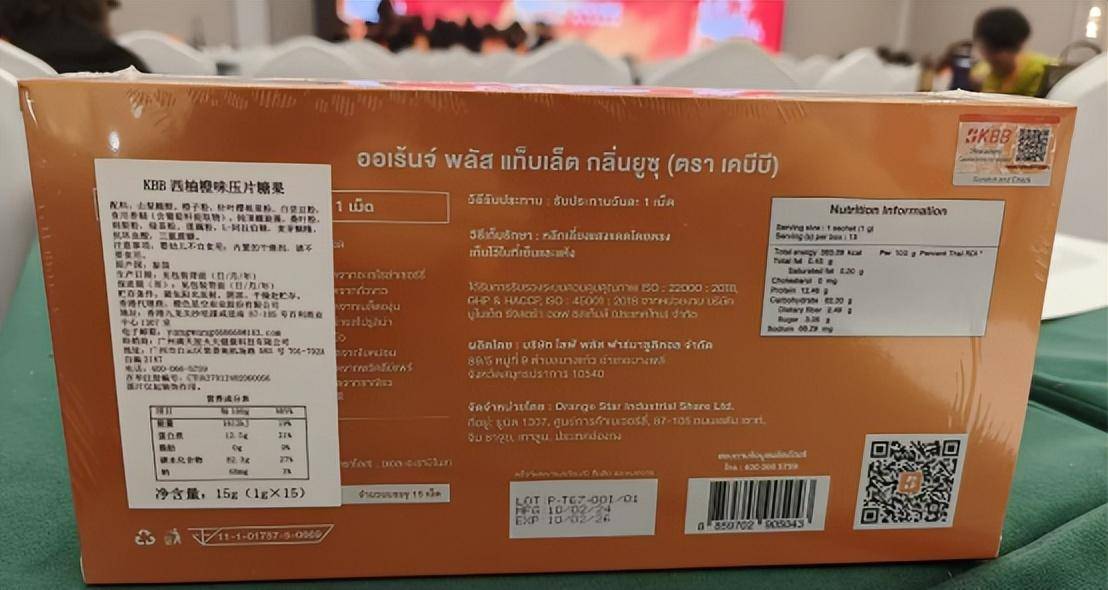 本网注意到,这款KBB阻脂片中文全称为KBB西柚橙味压片糖果。原产国为泰国,香港代理商:橙色星空实业股份有限公司,大陆经销商为广州满天星火大健康科技有限公司。