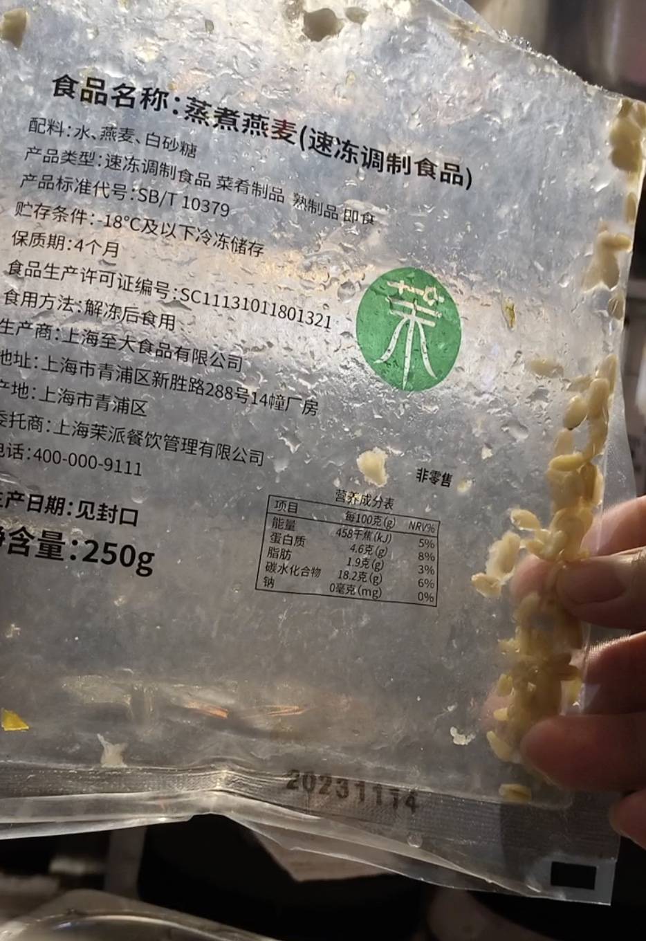 5月9日,记者上班时发现前区冷柜中有一袋青稞,它的生产日期是2023年11月23日,保质期为4个月。也就是说,这袋青稞已经过期40余天。