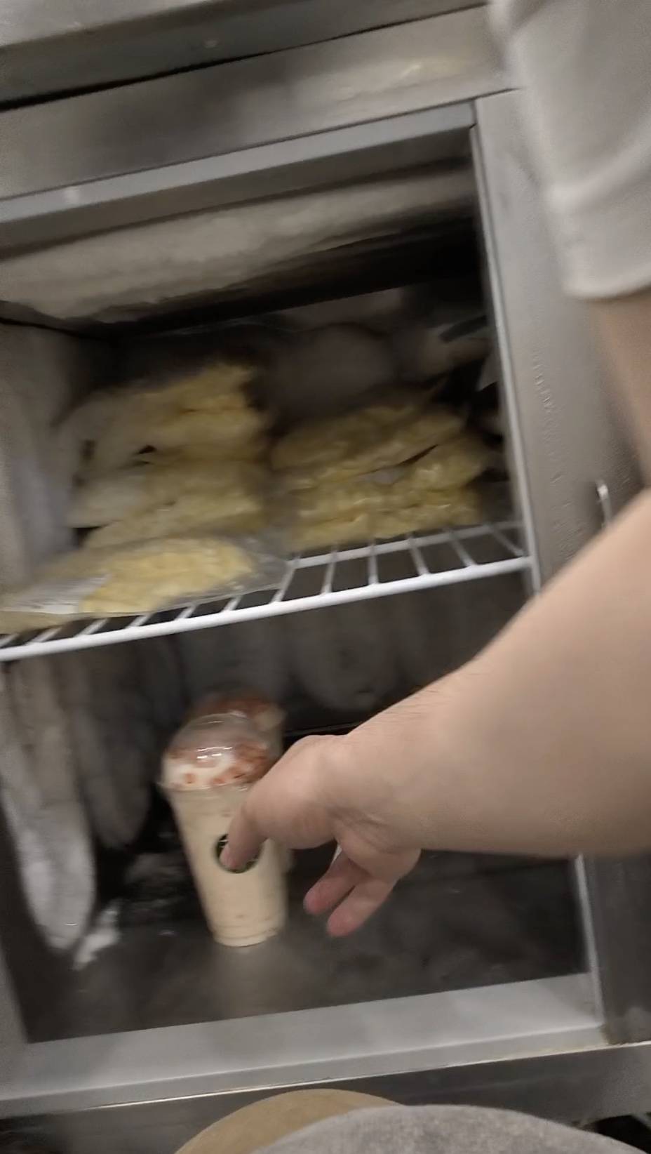 当外卖山楂奶昔时,可以直接从冷柜取出给骑手。而消费者当面购买时,则要先等几分钟,在消费者不注意时,从冷柜取出给消费者。
