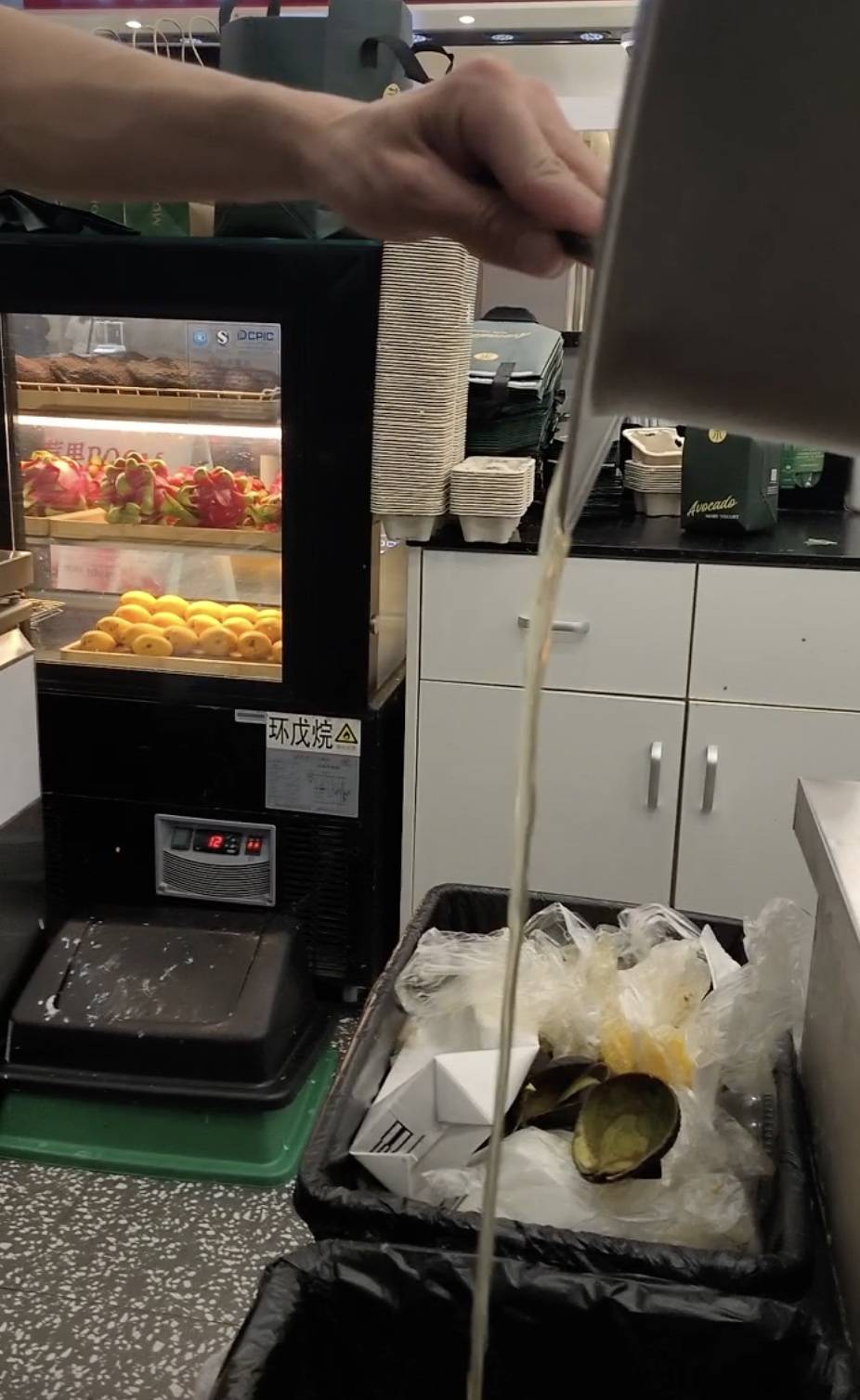 随后,制作奶昔的店员快步走去前台,将已经封盖正在等待外卖员取餐的两杯奶昔收回,挖去馊了的椰肉丁,盖上一勺刚拆封的新椰肉丁,重新封盖售出。