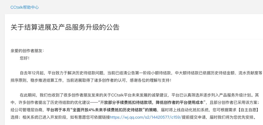 记者了解到,CCtalk目前整体欠款资金规模超6000万元,其中有部分资金以抵扣方式抵消欠款。换言之,讲师或机构未来若继续使用该平台授课,该平台将降低对其抽佣比例,从8%降至4%,以此抵消部分尚未还清的历史款项,签署该抵扣协议的讲师与机构将被优先安排还款。