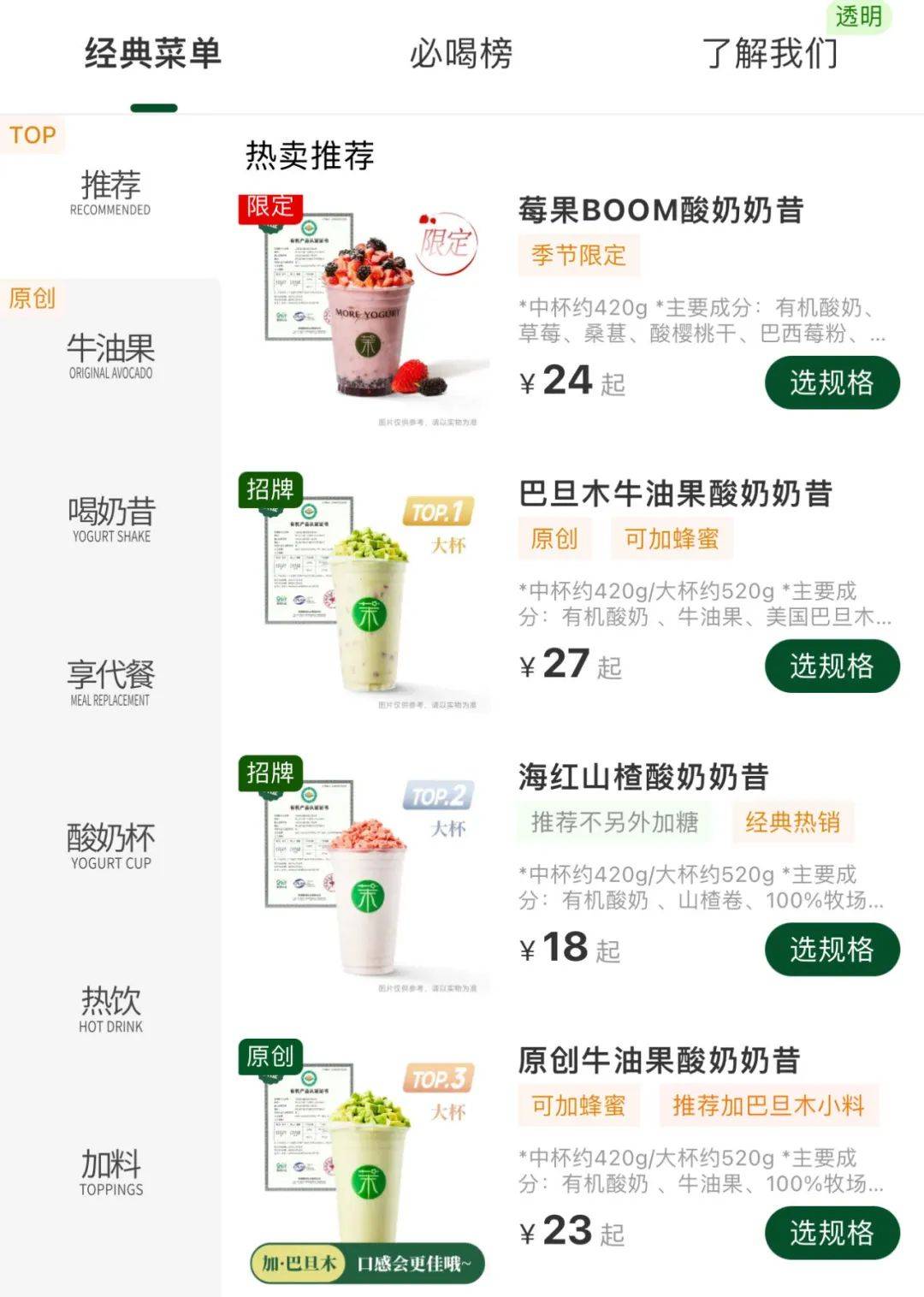 实际上,茉酸奶单价并不便宜。根据茉酸奶的微信点单小程序,其大部分产品售价都在20元左右。