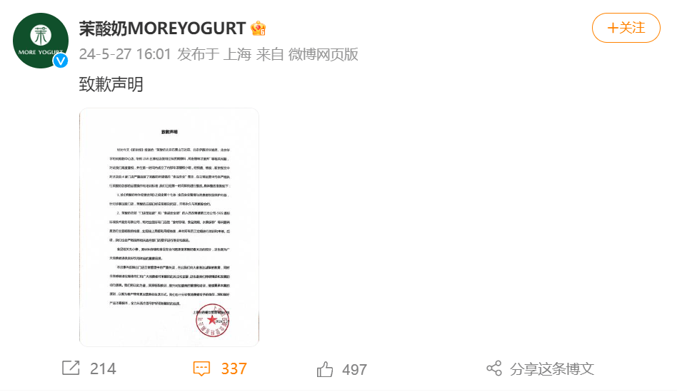 本次事件反映出门店日常管理中的严重失误,在此我们向大家表达诚挚的歉意,同时非常感谢诸位媒体同仁和广大消费者对茉酸奶的关注和监督,这也是我们持续精进和发展的动力源泉,我们将以此为鉴,深深吸取教训,提升对加盟商的管理和培训,继续秉承本真的原则,以期为客户带来更加营养的生活方式。我们也十分珍惜消费者给予的信任,深知做好产品才是根本,全力从各方面守护好现制酸奶的品质。