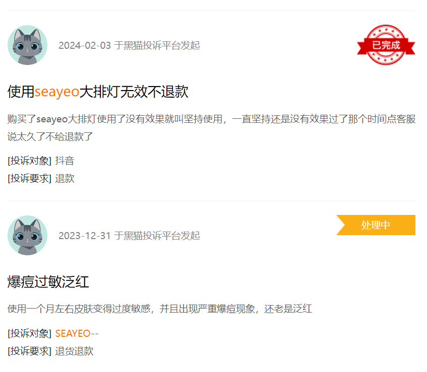 例如,据黑猫投诉平台的一条信息显示,SEAYEO昔又大排灯致角膜损伤。该消费者如此反馈,收货当天晚上,就戴上眼罩使用,但是照射后发现眼睛难受不舒服,觉得可能晃到了,以为睡一觉醒来就能好了。