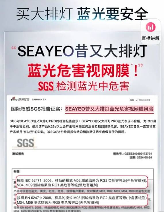 据悉,某媒体从SEAYEO官方旗舰店购买了热销的SEAYEO昔又大排灯PRO,并将其送至国际知名检测机构SGS进行检测后,SGS给出了一份权威报告。报告显示:“SEAYEO昔又大排灯PRO蓝光表现不合格,为RG2属于中危害组别,使用该产品0.25s以上会产生视网膜蓝光危害及视网膜热危害。”