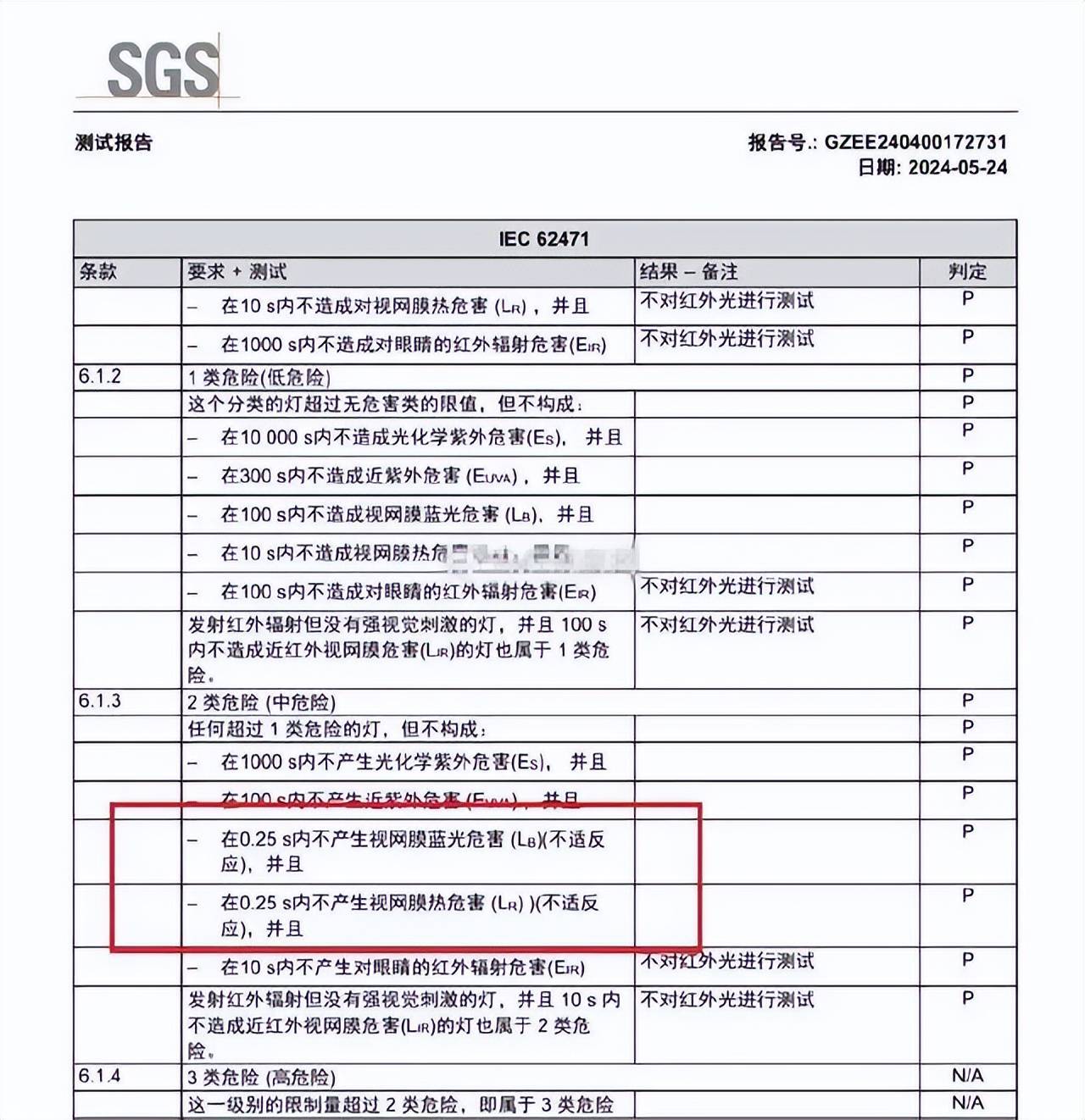 这份报告似乎给出了答案。SGS的报告中对SEAYEO昔又大排灯PRO的检测结果表明,如果长期使用中危害(RG2)蓝光,那么会对视网膜造成永久伤害。