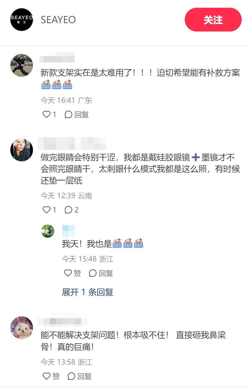 在小红书上,也不乏消费者投诉SEAYEO昔又大排灯“让近视度数加重”“光太刺眼”“用完不舒服”等问题,即使戴上了护目镜,照完光依然会感受到眼睛干涩。