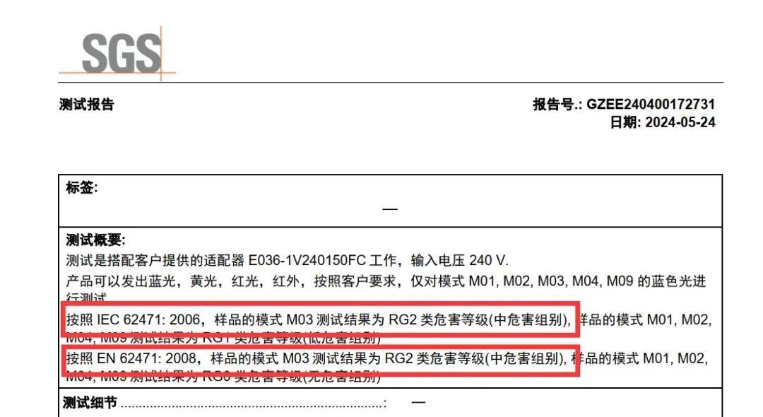 为了证实以上说法,有媒体从SEAYEO昔又官方旗舰店购买了同款的「SEAYEO昔又大排灯PRO」产品并送往权威机构SGS进行专业的安全性鉴定。其展示的测试报告结果显示,对照“IEC62471:2006”和“EN62471:2008”两种测试标准,「SEAYEO昔又大排灯PRO」含有的蓝光属于中危害组别(RG2类),即使用该产品0.25s以上会产生视网膜蓝光危害及视网膜热危害。