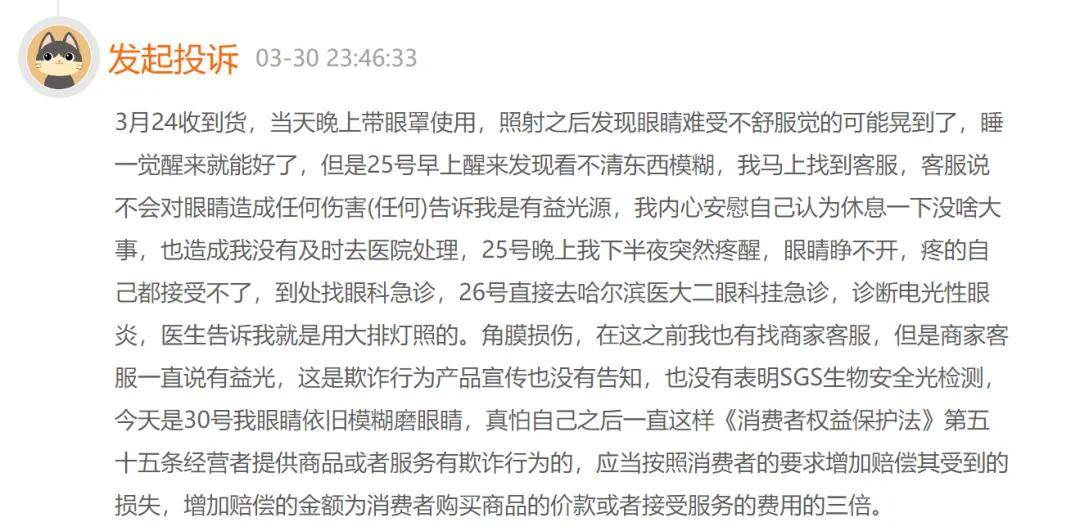 3月30日,一名消费者在互联网投诉平台上称,按照指导流程使用新购买的SEAYEO昔又大排灯照射面部后出现视力模糊的情况,随后被诊断为电光性眼炎。