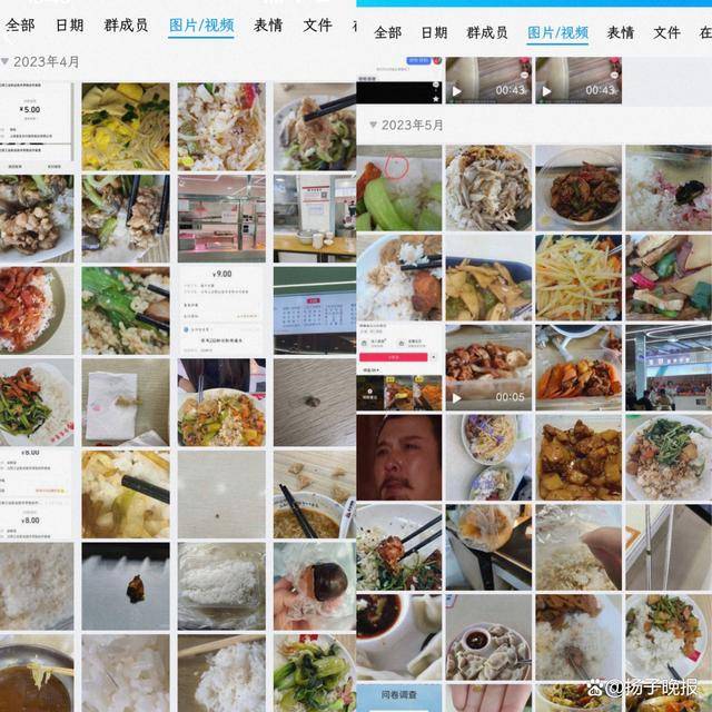 据该学生向记者出示的社交软件群聊图片记录显示,光是2023年4月,就有多达20张图片反映食堂菜品出现问题,5月则有近30张图片。