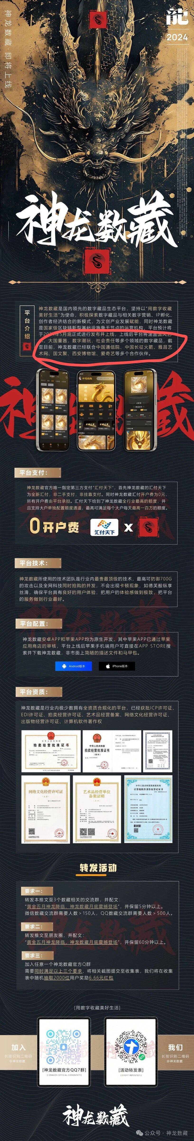 神龙数藏宣传期间,海报宣称是行业内极少数拥有全资质合规化平台,已获批ICP许可证、EDI许可证、拍卖经营许可证、艺术品经营备案、网络文化经营许可证、出版物经营许可证、计算机软件著作权,并附带展示数个证件证书。