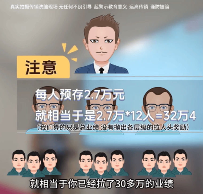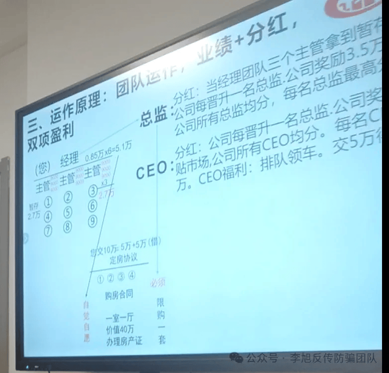 划重点:预交2.7万元,然后协助下面主管拉九个销售人员(即每人交2.7万,你+3主管+9销售就是12人*2.7万=32.4万)成为经理,再交10万即可获得排房资格!这时候只是资格,不是给你房,想要“免费”房还需要有四个跟你一样的经理且都交了10万签订房协议(即32.4*5个经理=162万+50万订房协议)。同理,想要车,你得晋升成为CEO,且也需要后面排了4个CEO,再交5万才可以“免费”领。