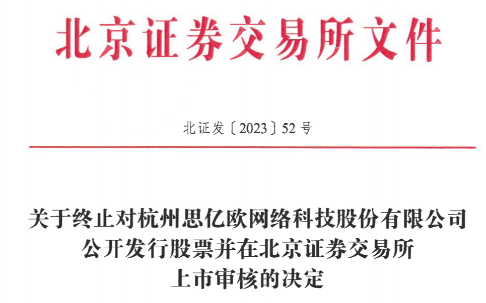根据有关规定,北交所决定终止思亿欧公开发行股票并在北京证券交易所上市的审核。