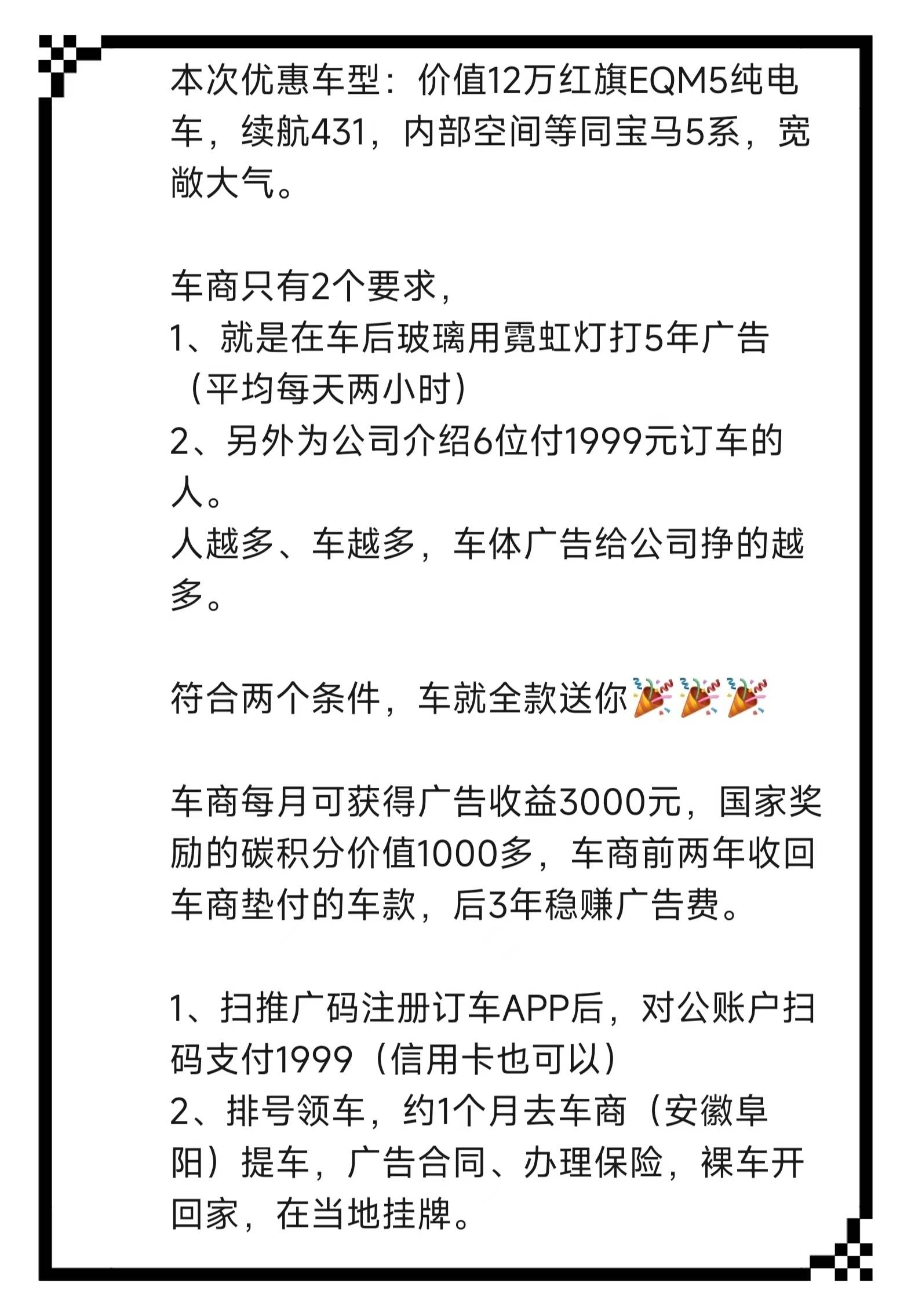 你相信么,花费1.4万元不但能赚9000元,还白送你一辆全新的红旗新能源EQM5轿车?