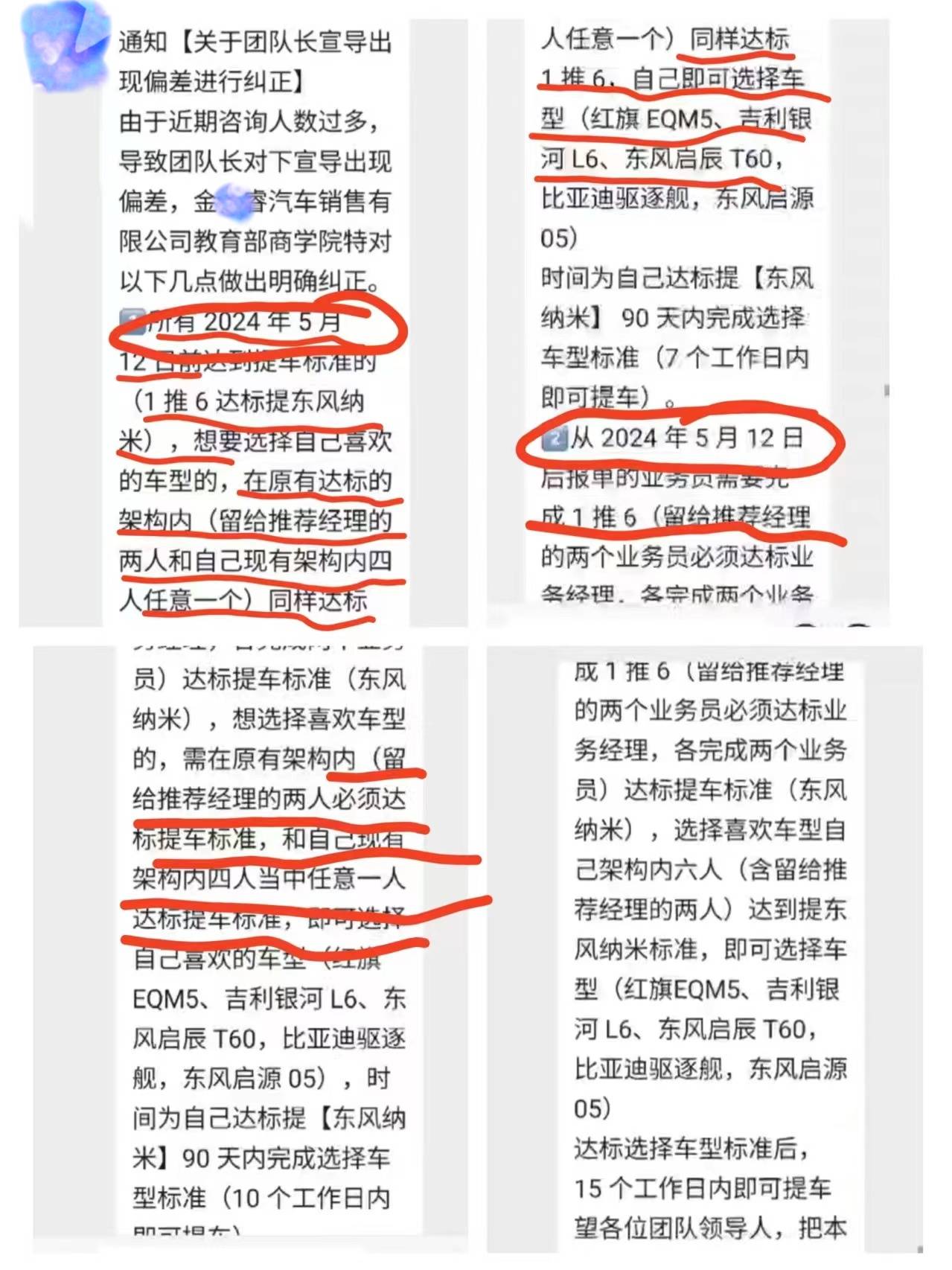 6月1日,公司又更改了提车标准,需要直推的6位业务员全部达到提车标准才能获得红旗车。也就是说,不单单需要推荐6位业务员,还需要这6位业务员继续向下建立团队完成送车任务,才能拿到奖励。