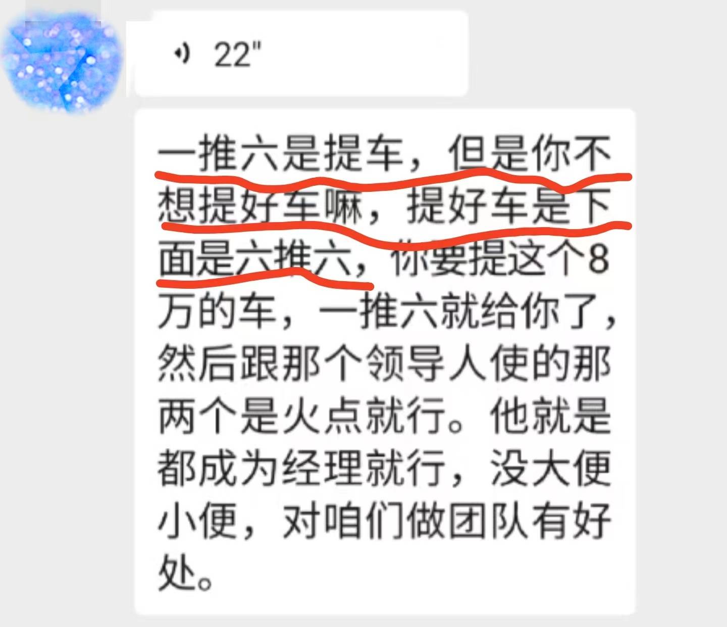 公司规定,1推6只能获得8万元的“东风纳米”,想要提“好车”,除了推荐6名业务员,还要将起其中两名推荐人培养成业务经理,而想要成为业务经理,需要他们继续发展下线,再直推两位新人,任务才算完成。
