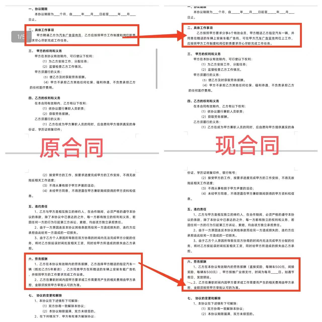 孙先生称,推荐人告诉他只要推荐的6名业务员且交纳1999元激活就能提走红旗车。但是仅仅半个月过去,公司便改了说辞。合同中的具体工作事项和劳务报酬都做了更改。