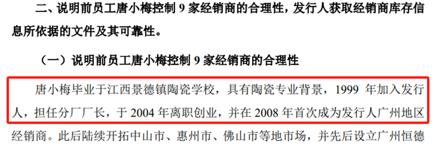 《审核问询函的回复》中披露,新明珠存在部分前员工、董监高近亲属设立的经销商,其中就包括“广州恒德建材有限公司等9家经销商是前员工唐小梅所控制”,并明确标注了从“2008 年合作至今”,也即与唐小梅控制的经销商从2008年就开始合作了。同时还详细披露了这9家经销商,分别为: