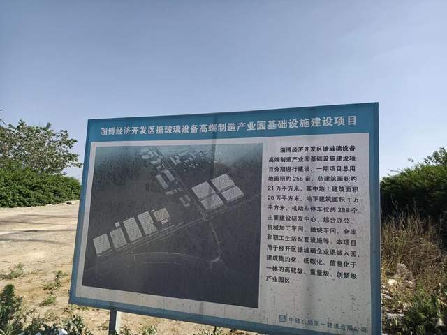 凤凰网《风暴眼》来到原奇辉陶瓷厂所在位置,这里在荒地旁已经搭起了临时建设板房,然而却没有任何动工迹象。荒地前的立牌上显示,此地将建设淄博经开区搪玻璃设备高端制造产业园。