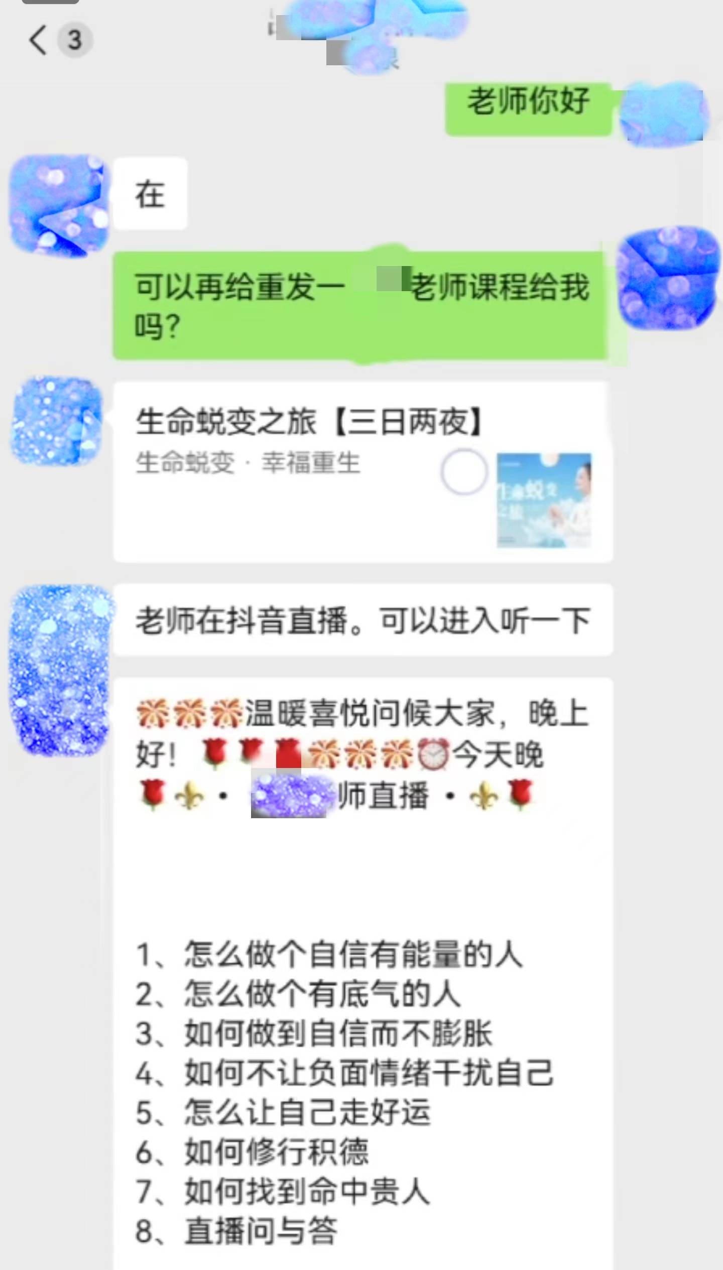 张先生还发现,课程中“吕某”会通过分析学员“命格”,号称命中有“大爱”,以十分适合分享“大爱”为由,不断诱导学员花钱参与更高阶的课程,并加入“智慧学院”成为“天使老师”。