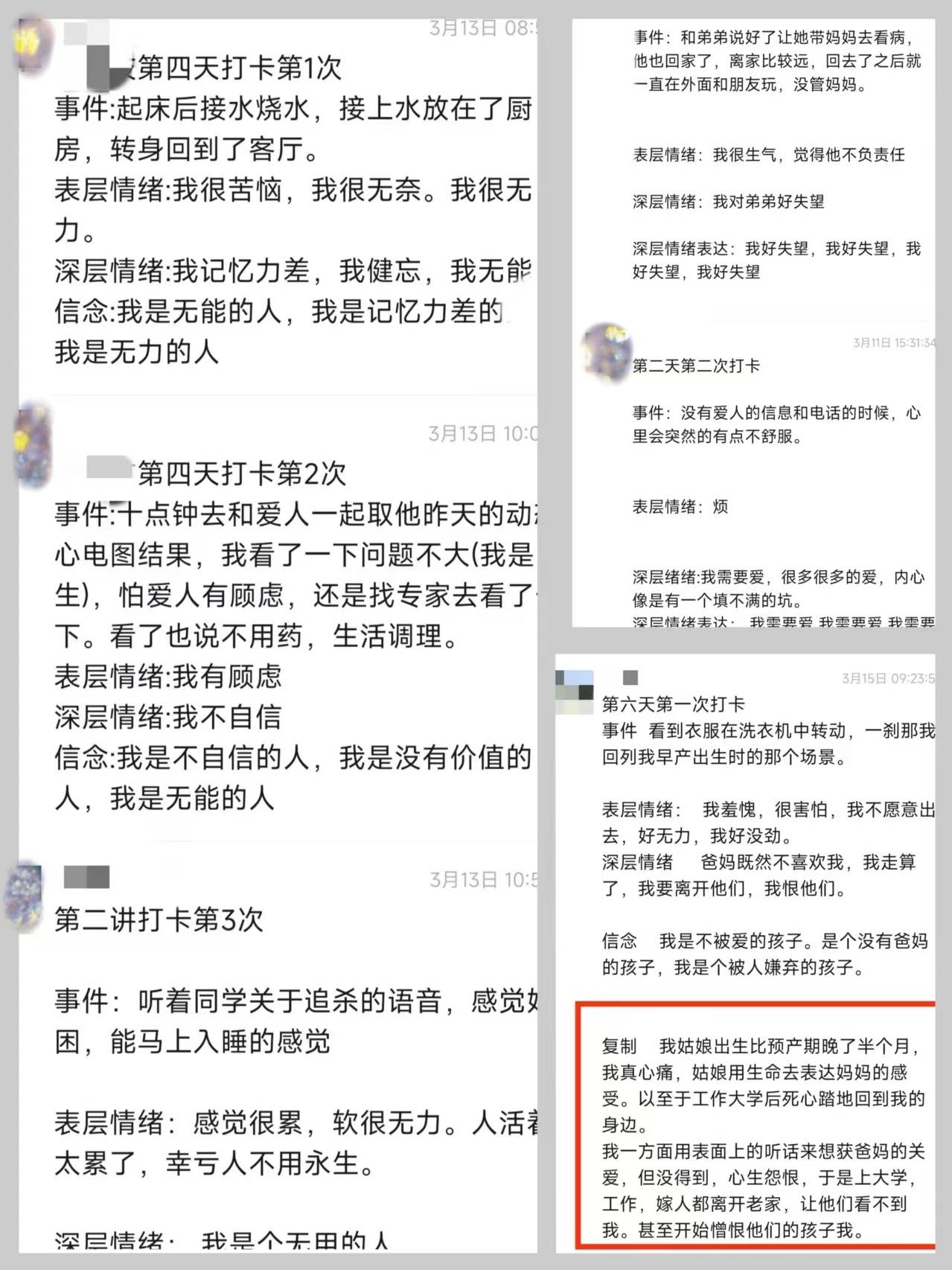 在赵先生提供的资料中可以发现,该课程是以原生家庭为“痛点”的,学员会在一次次的打卡练习中,将身上的所有不足归结在原生家庭里,甚至会产生仇视亲人的思想。