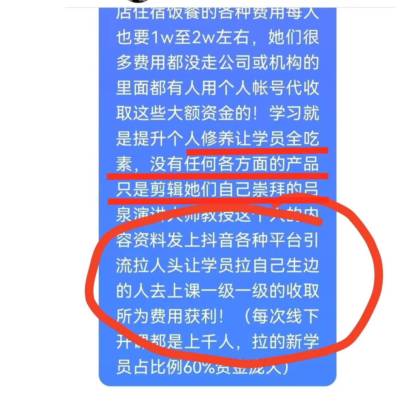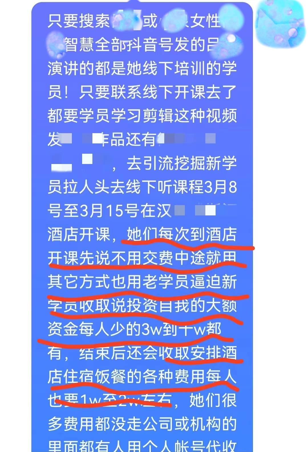 新学员参与课程时,对方说是免费,但中途会采取各种方式游说学员以为自己投资为由,交纳3万-10万元不等的费用。课程结束后,还会收取1万-2万元的酒店住宿费和餐饮费。