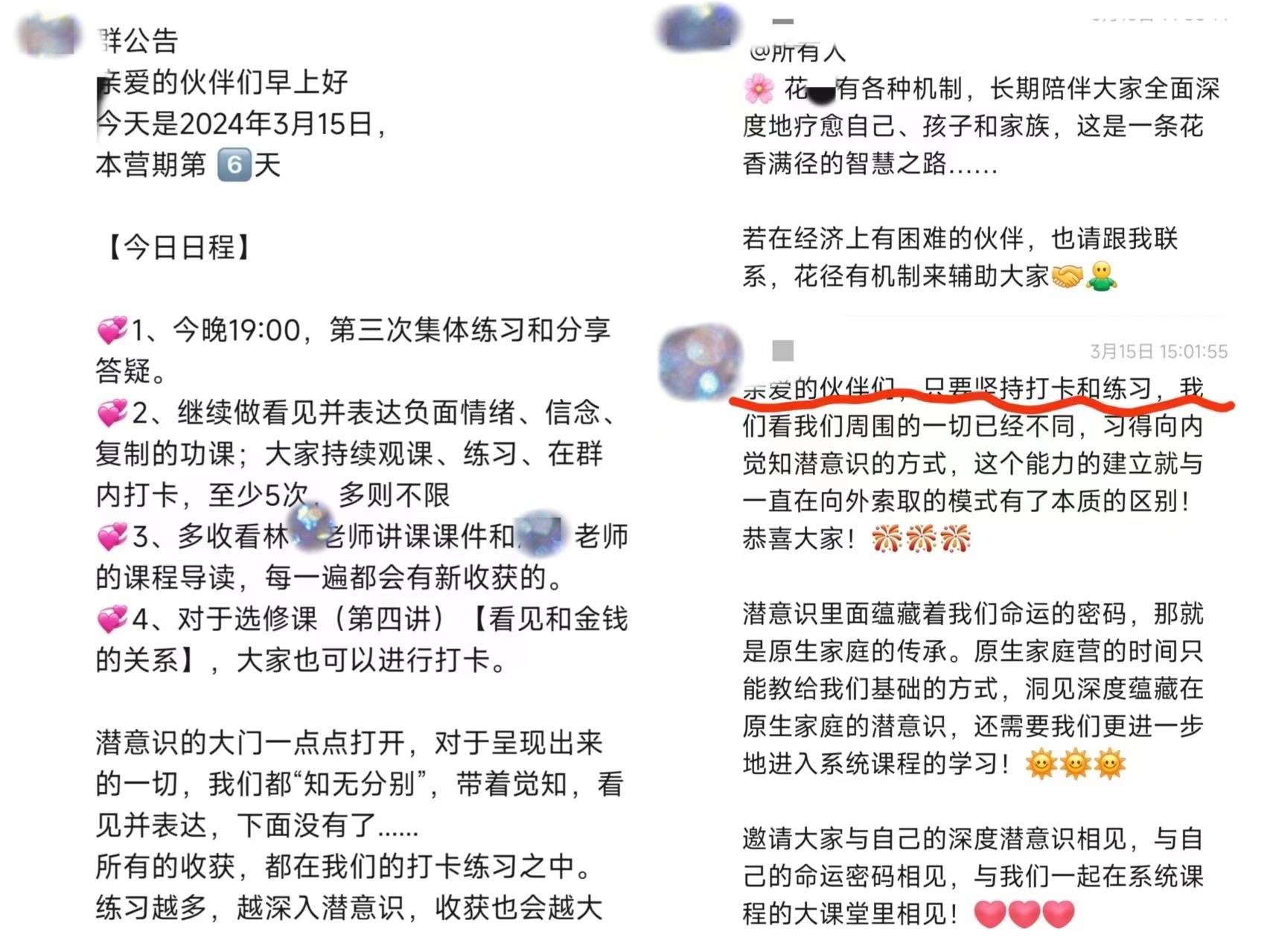购买成功后,学员会被拉进群里,群内老师会让学员每天按要求进入“潜意识”,练习并在群内打卡。