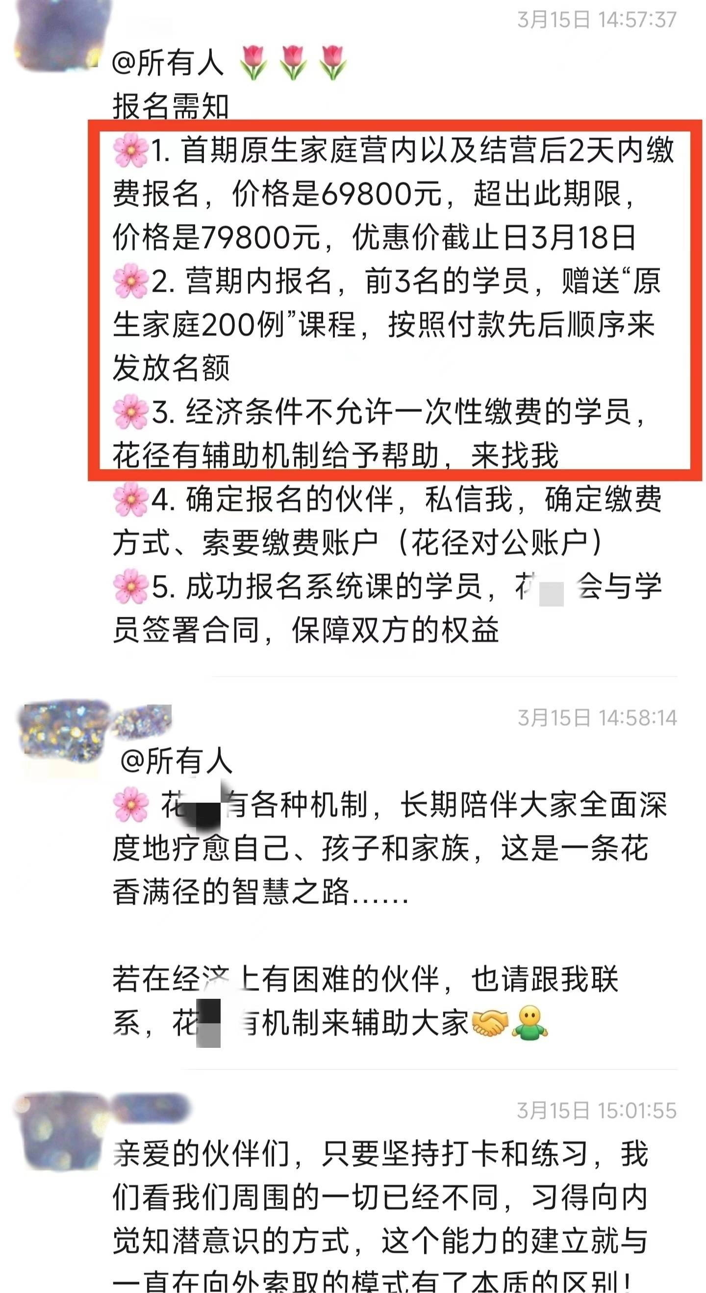 十分担心的赵先生经多番调查,发现“花某原生家庭”的课程学费不但十分高昂,学员还会被“老师”诱导,层层递进。先是购买999元课程简单学习,随后就会被要求继续购买6万元的课程进行下一环节。