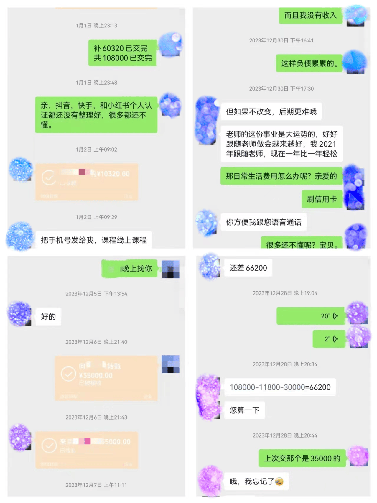 但是,一段时间之后,赵先生却发现妻子越发入迷,已经先后交纳了9000元购买课程的妻子还要再交纳6万元继续学习,群内老师得知妻子没有这么多钱后甚至鼓动妻子分期付款。