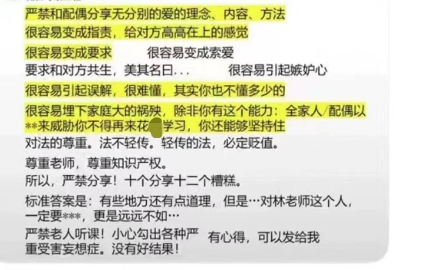 并且,“老师”还会不断向学员灌输“严禁与配偶分享”、“即使全家人都来威胁你不要学习,你也要能够坚持”的思想,这也使得很多学员不顾身边人的劝阻,越陷越深,这也为“解救”增加了难度。