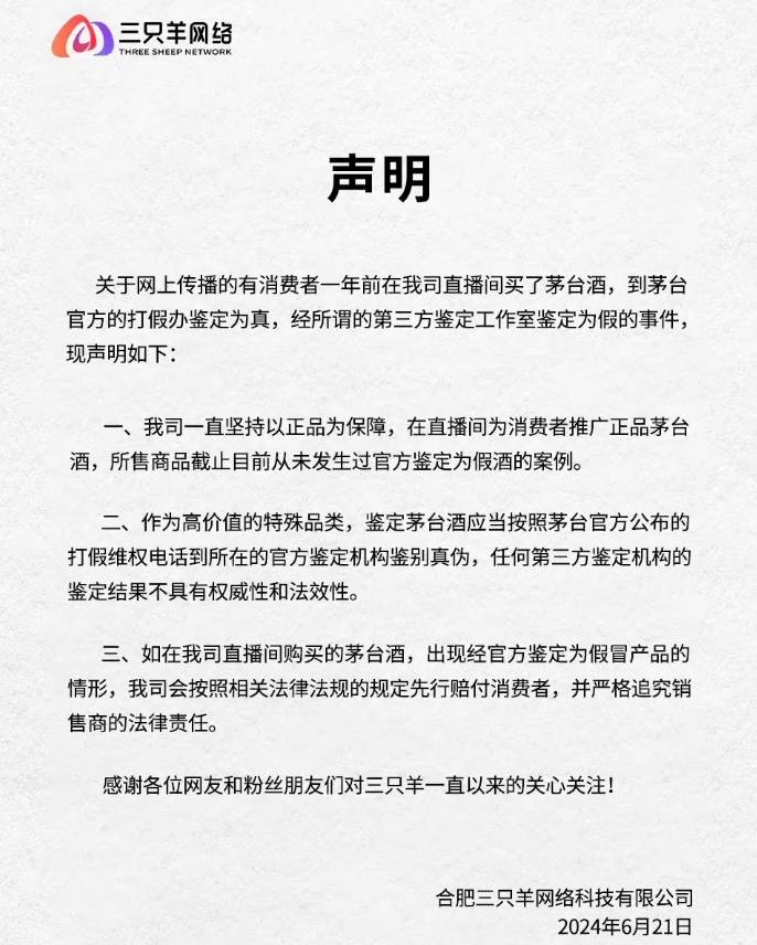 6月21日,三只羊集团发布声明,表示“鉴定茅台酒应当按照茅台官方公布的打假维权电话到所在的官方鉴定机构鉴别真伪,任何第三方鉴定机构的鉴定结果不具有权威性和法效性。”